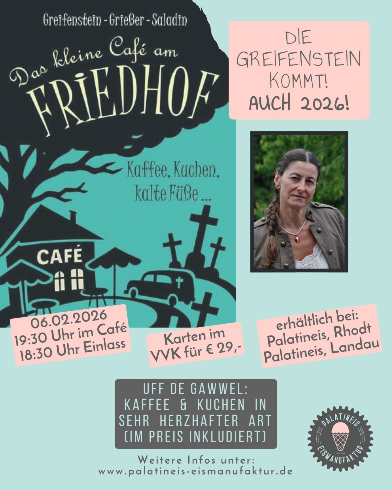 Denn: Es beehrt uns bereits zum zweiten Mal Gina Greifenstein mit ihrer mordlüsternen Anwesenheit im Café. Sie liest aus ihrem neusten Buch "Das kleine Café am Friedhof - Kaffee, Kuchen, kalte Füße..." und hat im Laufe des Abends ganz bestimmt auch die ein- oder andere "Anregung" parat, um etwas Leckeres "zu Tisch", bzw. jemand Halbgeliebten "um's Eck zu bringen". Natürlich auf seeehr humorvolle Art und Weise... ⚰️😆