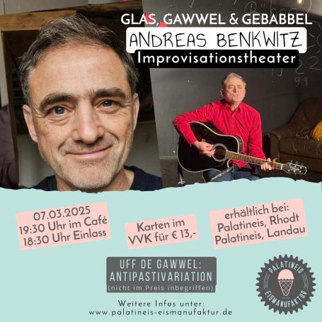 Unser erster Kulturabend in Rhodt bietet euch eine Mischung aus Improvisationstheater 🎭 und (a little bit) Musik 🎶🎤 Als langjähriger Bühnenprofi und Wiederholungstäter wird Andreas Benkwitz dem Abend ordentlich Dynamik verpassen. Ihr als Gäste seid dabei aktiver Teil des Geschehens.